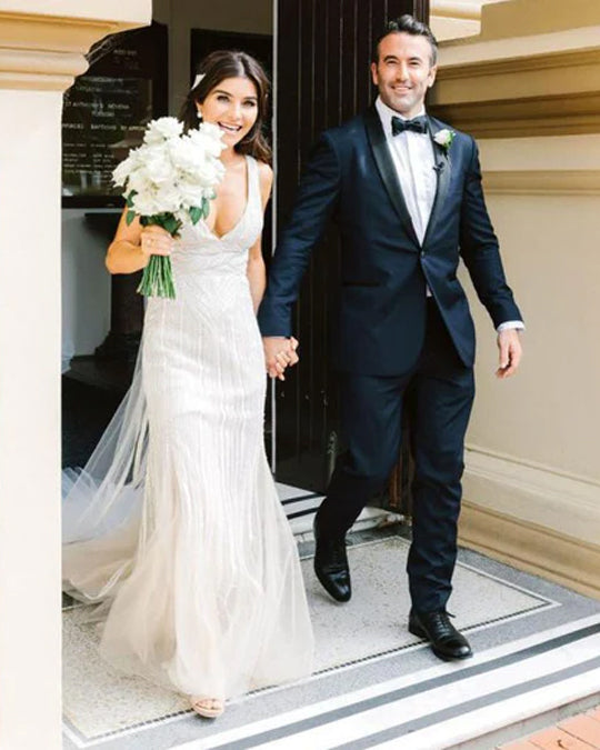 Eminent beauty therapist Jocelyn Petroni looked her radiant best when she tied the knot with John Clarkson in a chic black and white affair.